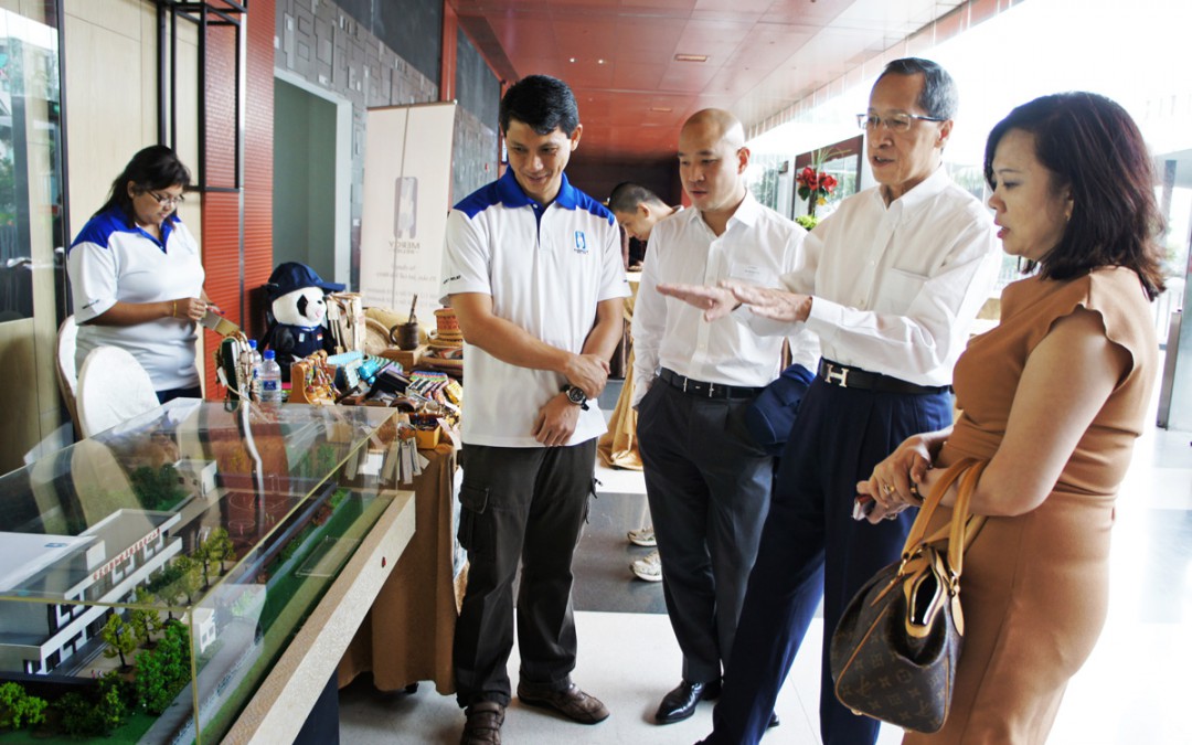 (left) Guest-of-Honour Mr Kwek Leng Joo (2nd from right) reflecting on Hong Leong Group’s participation in the post Wenchuan earthquake 2008 in front of the architectural model of MR’s reconstructed Wolong-Hong Leong Primary School.